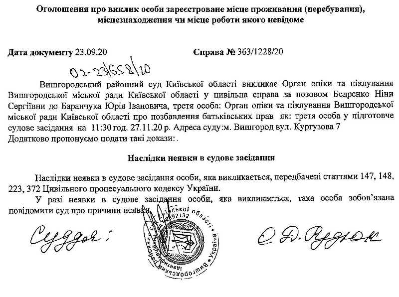 Орган опіки та піклування Вишгородської міської ради Київської області викликається в якості третьої особи до суду 27.11.20 року на 11:30 годин, цивільна справа №363/1228/20