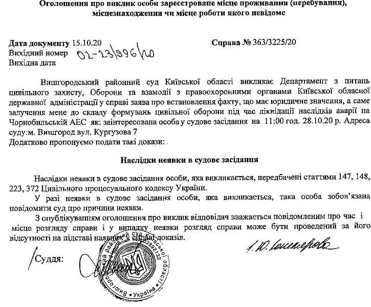 Департамент з питань цивільного захисту, оборони та взаємодії з правоохоронними органами Київської обласної державної адміністрації викликається в якості заінтересованої особи до суду 28.10.20 року на 11:00 годин, цивільна справа №363/3225/20