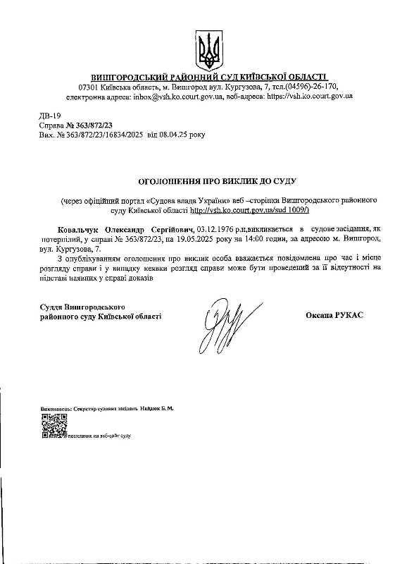 Оголошення про виклик до суду у справі № 363/872/23