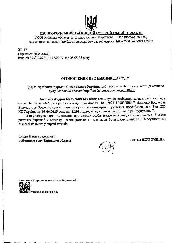 Оголошення про виклик до суду у справі № 363/324/23