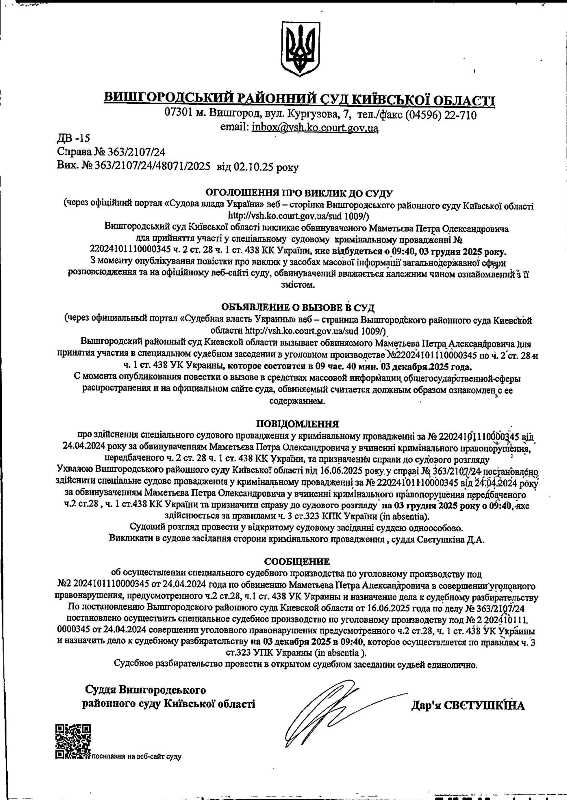 Оголошення про виклик до суду у справі № 363/2107/24