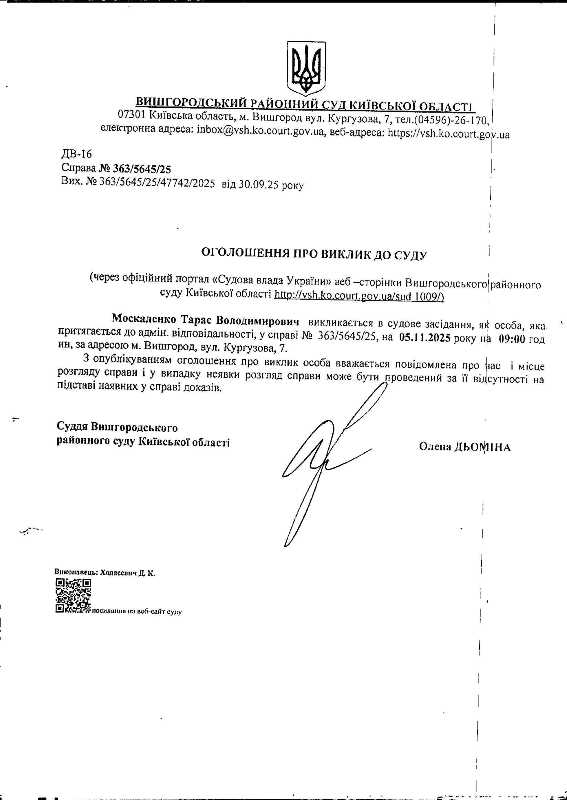 Оголошення про виклик до суду у справі № 363/5645/25