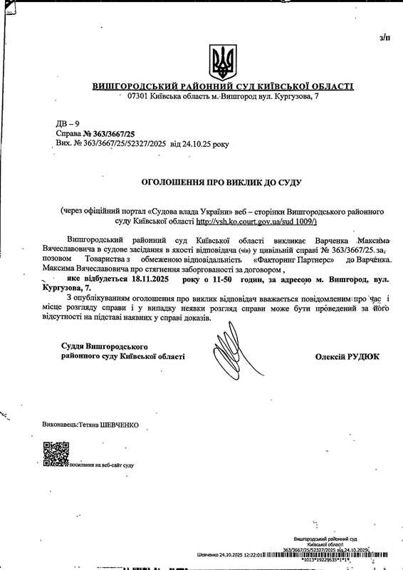 Оголошення про виклик до суду у справі № 363/3667/25