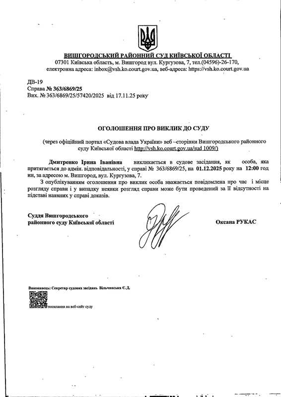 Оголошення про виклик до суду у справі № 363/6869/25