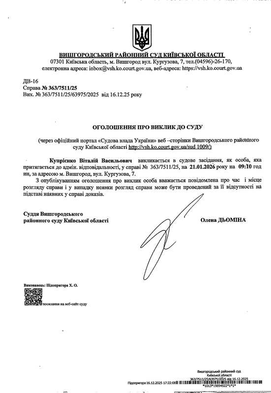 Оголошення про виклик до суду у справі № 363/7511/25