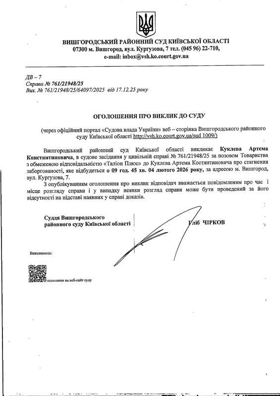 Оголошення про виклик до суду у справі № 761/21948/25