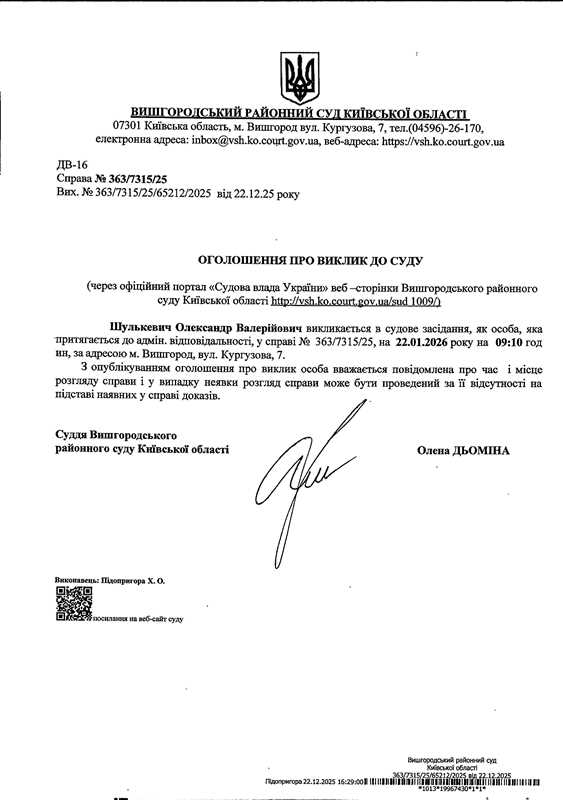 Оголошення про виклик до суду у справі № 363/7315/25