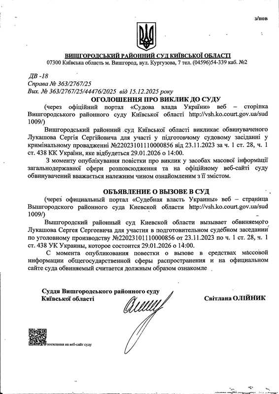 Оголошення про виклик до суду у справі № 363/2767/25