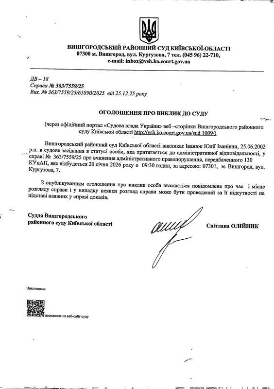 Оголошення про виклик до суду у справі № 363/7559/25