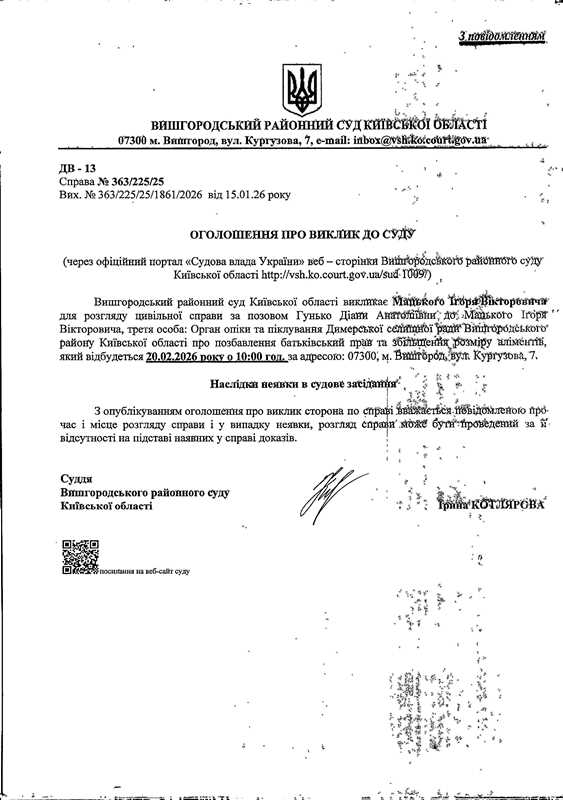 Оголошення про виклик до суду у справі № 363/225/25