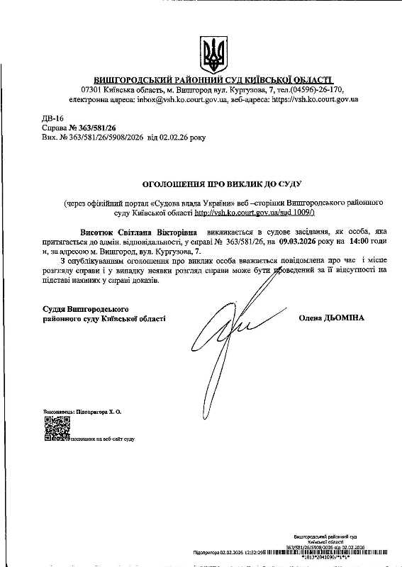 Оголошення про виклик до суду у справі № 363/581/26