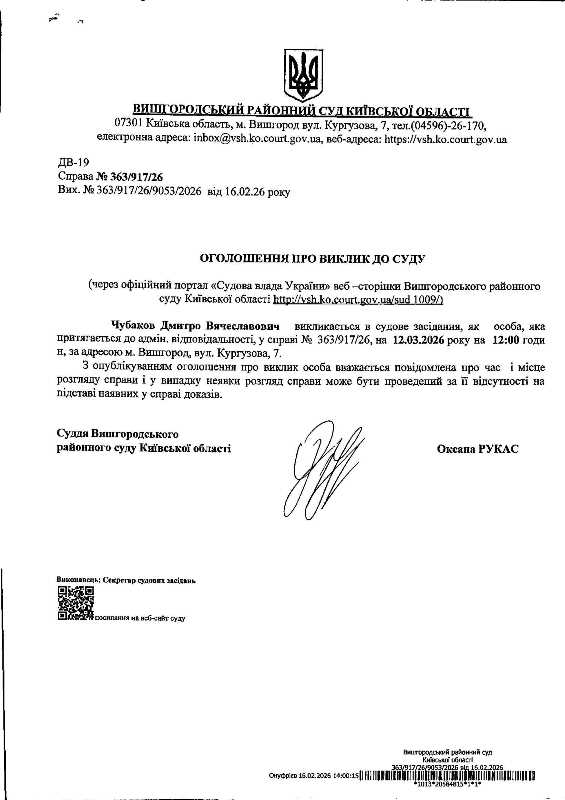 Оголошення про виклик до суду у справі № 363/917/26