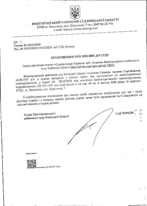 Оголошення про виклик до суду у справі № 363/218/26
