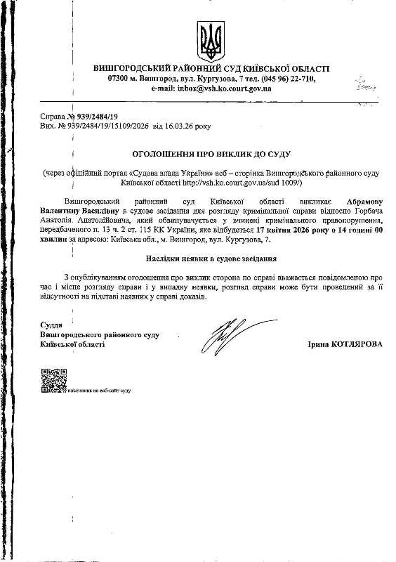 Оголошення про виклик до суду у справі № 939/2484/19