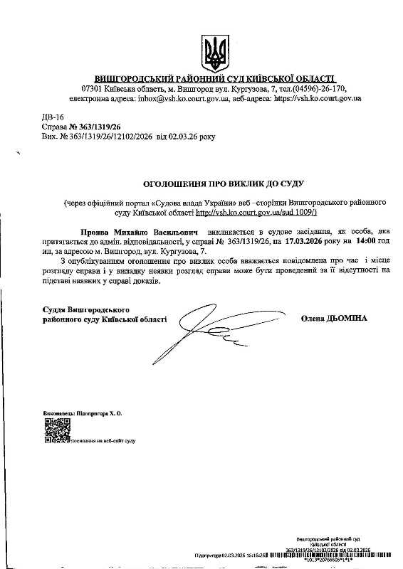 Оголошення про виклик до суду у справі № 363/1319/26