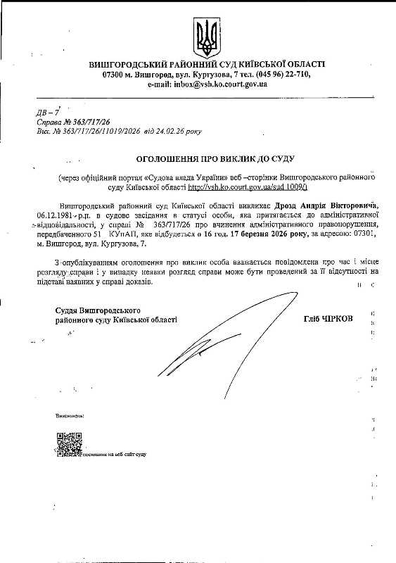 Оголошення про виклик до суду у справі № 363/717/26