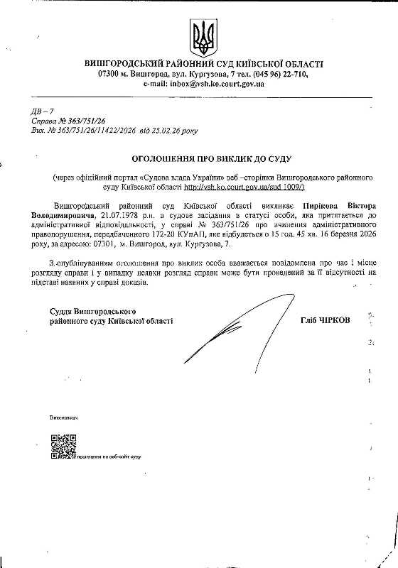 Оголошення про виклик до суду у справі № 363/751/26