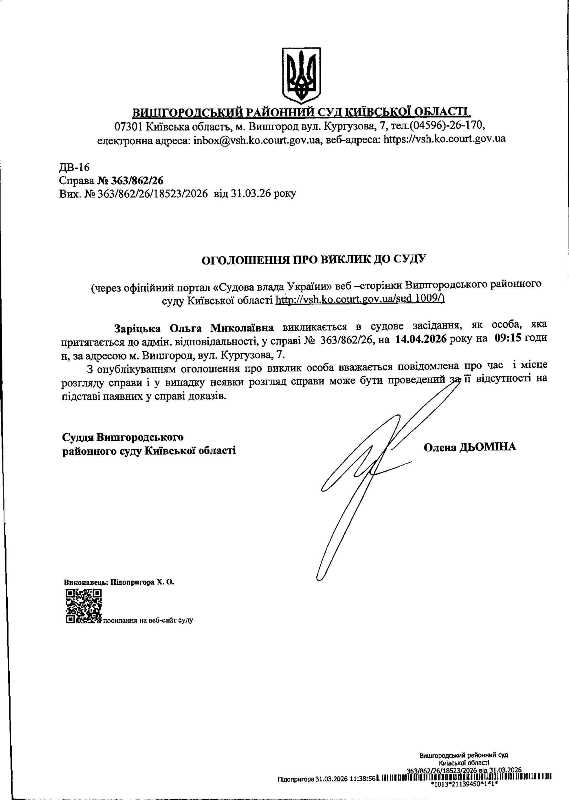 Оголошення про виклик до суду у справі № 363/862/26