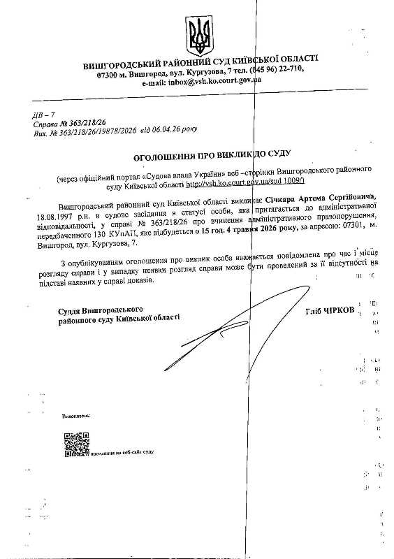 Оголошення про виклик до суду у справі № 363/218/26